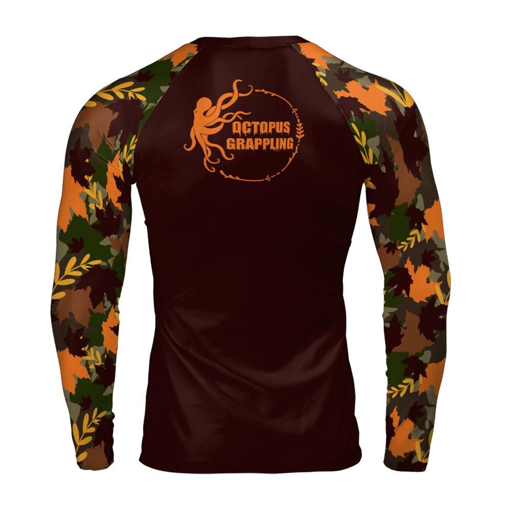 The leaf camo–inspired sleeves tie in fall vibes with a tactical twist — blending autumn tones with a design meant to disappear in the chaos of open mat (if you could ever hide a look this bold). Built for performance and comfort, the moisture-wicking, 4-way stretch fabric keeps you cool while the compression fit supports your grind. Flatlock stitching and fade-resistant prints ensure this rashguard can handle everything from warmups to post-feast grappling battles.